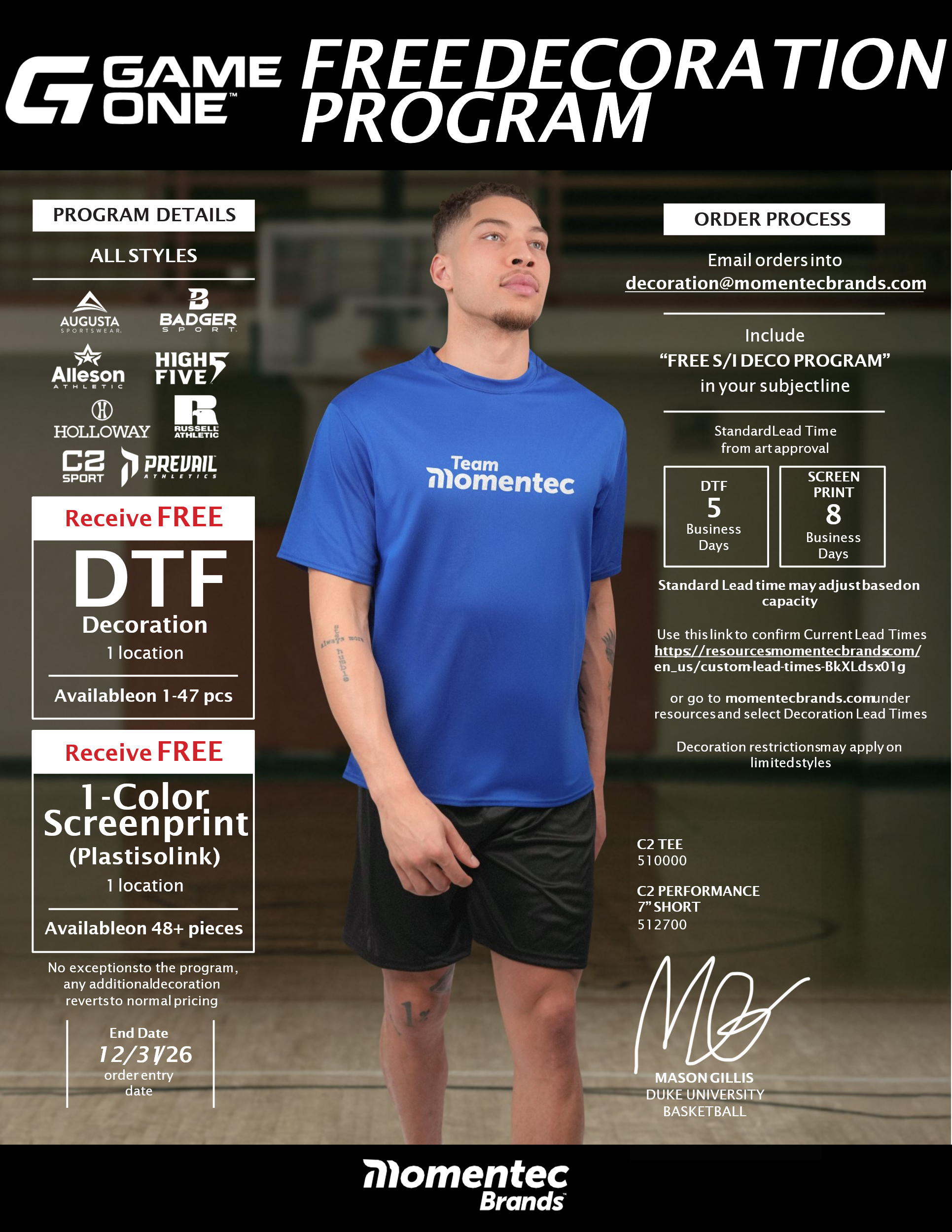 Momentec is offering free decoration on all of their brands. This includes; Badger, Alleson, C2 Sport, Augusta, Holloway, and Russell. The below criteria must be met with your order submission.